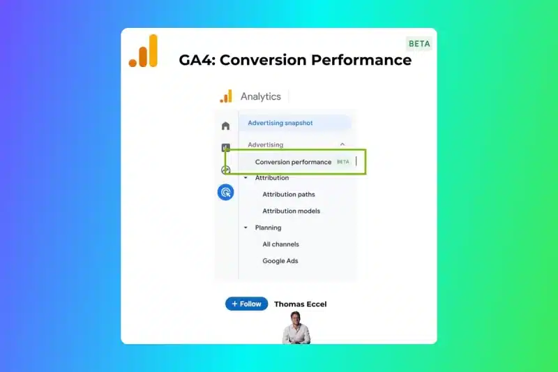 Google Analytics 4 heeft een bètaversie van een nieuwe functie geïntroduceerd genaamd “Conversie Prestaties”. De functie stelt gebruikers in staat om conversieprestaties in de loop van de tijd te bekijken, conversies te analyseren en te segmenteren per kanaalgroep. Deze bètafunctie is mogelijk een vroeg experiment om de gebruiksvriendelijkheid en bruikbaarheid van het platform te verbeteren. Je kunt het vinden onder Adverteren -> Conversieprestaties.